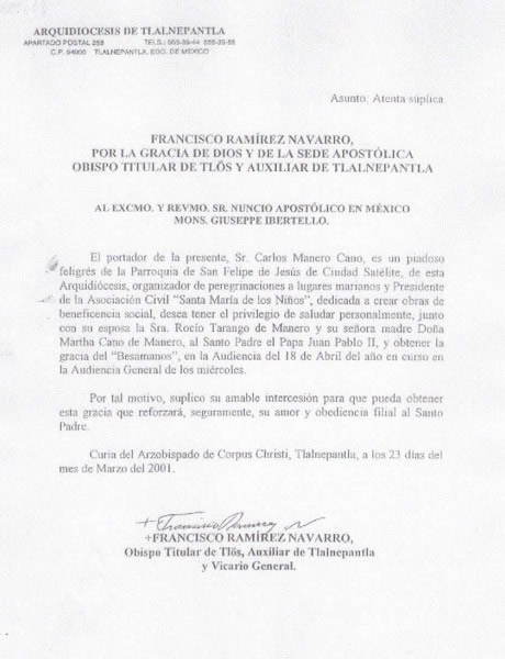 Carta del Santuario Diocesano de San Felipe de Jesús